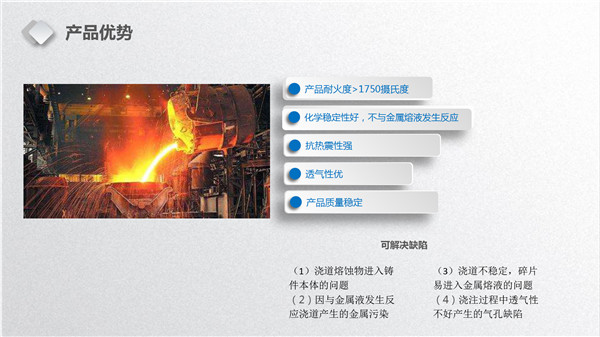 我司是研發(fā)、生產(chǎn)鑄造專用高溫陶瓷澆道管、橫澆道、直澆道、內(nèi)澆道、澆口杯、過濾座等系列產(chǎn)品的高科技企業(yè),耐火陶瓷管產(chǎn)品性能在行業(yè)中處于領(lǐng)先地位,填補了國內(nèi)空白,是提高鑄件內(nèi)在質(zhì)量的必備輔助材料。在中國是核電、高鐵及跨國大型鑄造集團指定耐火澆道供應(yīng)商。經(jīng)過應(yīng)流股份(603308)、中車集團株洲電力機車有限公司、中車集團長江車輛有限公司銅陵分公司,株洲斯威鐵路產(chǎn)品有限公司、泰鋼合金(深圳)、Metso Outotec、andritz、江蘇神通閥門股份有限公司等數(shù)十家集團企業(yè)的使用,一致認(rèn)為該系列產(chǎn)品能有效提高鑄件質(zhì)量。特別是對檢測手段嚴(yán)格的高端鑄件質(zhì)量提高明顯。廣泛用于高端鑄造企業(yè)生產(chǎn)核電、礦機、高鐵、風(fēng)電等高端鑄件。